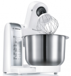 Кухонна машина Bosch MUM58M59 потужністю 1000 Вт об’єднує 11 насадок для подрібнення, змішування, збивання та м’ясорубку. Оснащена системою 3D PlanetaryMixing, 7 швидкісними режимами, металевою чашею на 3,9 л і LED-дисплеєм. Має корпус із металу та пластику, а аксесуари можна мити в посудомийній машині.