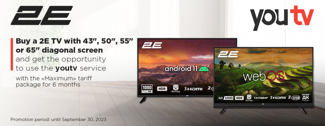 Buy a 2E TV with a diagonal of 43", 50", 55" or 65" and get access to watching 400+ TV channels and 10,000+ movies of the "Maximum" tariff plan of the youtv service for 6 months.