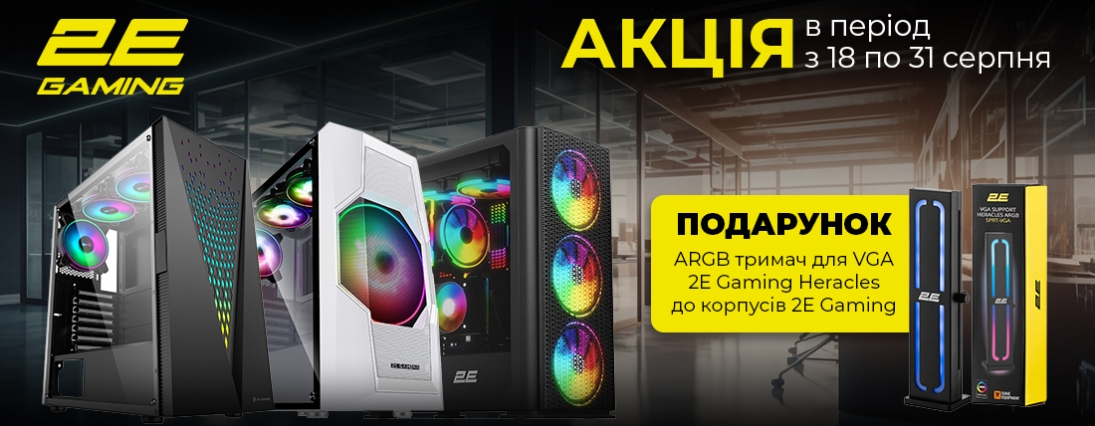 В період з 18 по 31 серпня при замовленні корпусів 2Е Gaming подарунок до кожної одиниці товару: тримач для відеоадаптера з ARGB-підсвіченням 2E Gaming (2E-SPRT-VGA).