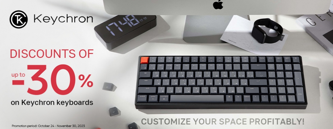 Розпочинається спеціальна цінова пропозиція Keychron на сучасні, універсальні та ультракастомізовані механічні клавіатури бренду. Чудова нагода вибрати пристрої з офіційною українською локалізацією, які підтримують Mac та Windows, одночасно підключаються до трьох пристроїв і легко перемикаються між ними. Для швидкої та ефективної роботи, гри та творчості знижки до 30 % діють на широкий асортимент Keychron з 24.10 до 30.11.23 року.