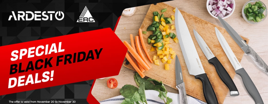 The ARDESTO Gemini Gourmet set includes basic knives: a chef knife (20.3cm), an all-purpose knife (12.7cm) and a paring knife (8.9cm). The blades are made of 3cr13 stainless steel, and the handles are made of black plastic. Not dishwasher-safe.