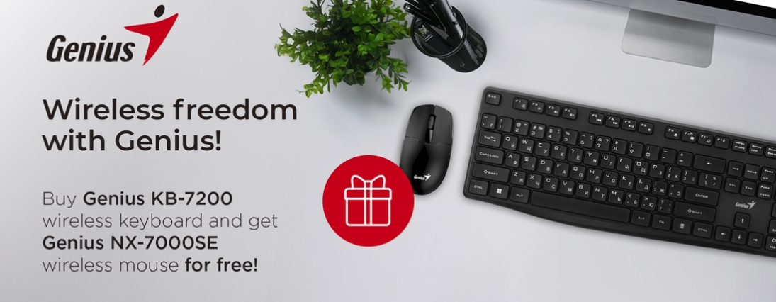 Придбайте бездротову клавіатуру Genius KB-7200 та отримайте бездротову мишу Genius NX-7000SE як подарунок! Genius KB-7200 – це поєднання комфорту, тиші та функціональності.