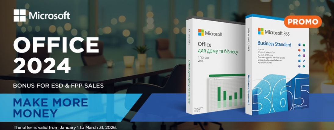 During the offer period, from January 1 to March 31, 2026, increase your profit in the form of a bonus of up to 7 currency units (at the exchange rate in UAH) for each "office." To receive bonuses, purchase 5 or more units of the following software products: