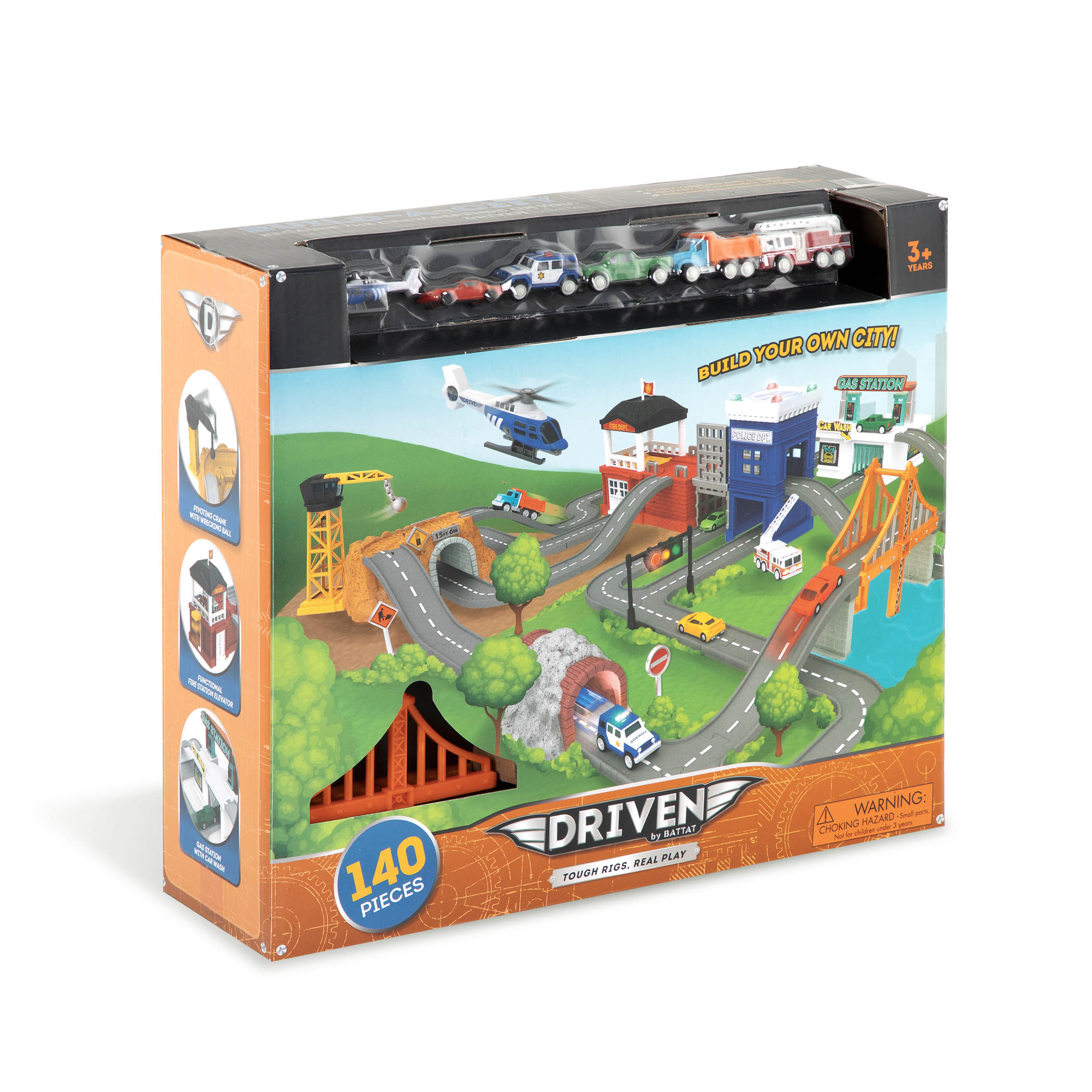Волю творчості й уяві з меганабором DRIVEN POCKET SERIES Build-A-City. У комплекті є все необхідне, щоби збудувати власне місто: автомобільні траси, доріжки, мініатюрні дорожні знаки, тунелі й мости, пандуси й перехрестя, міські споруди та різноманітні аксесуари – 140 деталей, з-поміж яких шість транспортних засобів. Неспростовними перевагами й водночас особливостями ігрового набору Build-A-City є якісне виконання й неймовірна реалістичність, з-поміж цікавих функцій: рухомий кран, деталізовані й функціонуючі АЗС і мийка, робочий ліфт. До того ж меганабір сумісний з усіма іграшками DRIVEN серії POCKET.