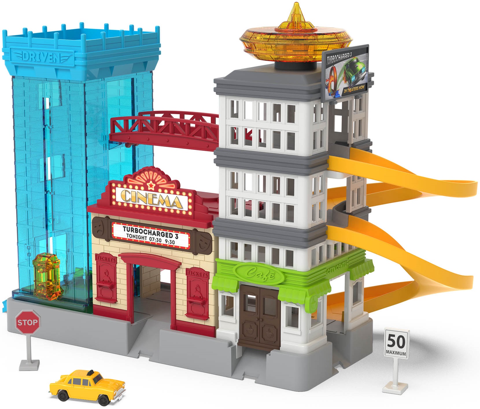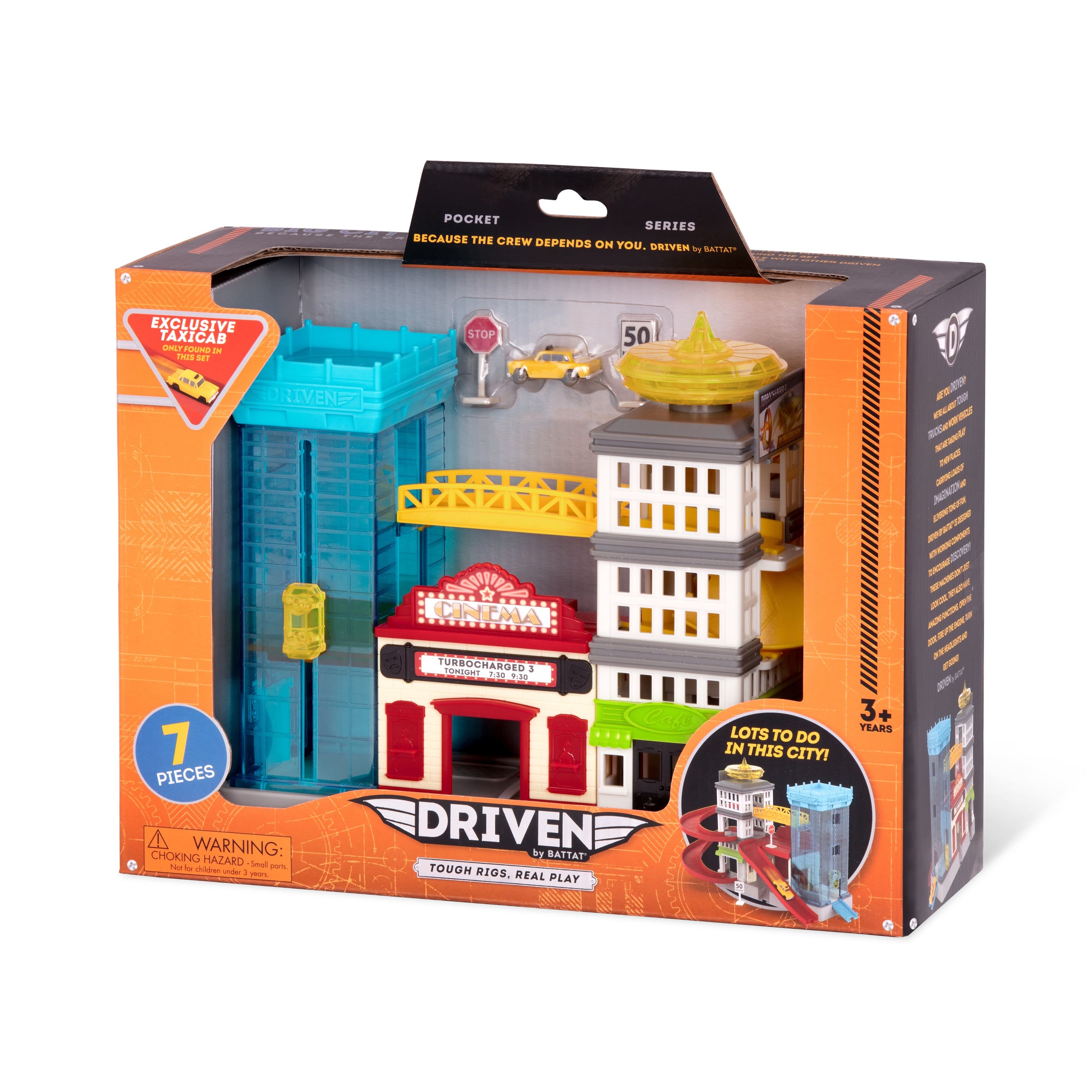 Пояснити дітлахам особливості життя у великому місті допоможе набір POCKET SERIES. Піймавши таксі, можна дослідити велике місто, адже в його центрі є на що подивитися... Будинки, рекламні щити та яскраві вогні міста чекають на відкриття! У наборі міститься сім елементів, з-поміж яких ексклюзивний автомобіль таксі, будівлі, пандуси, ліфти тощо. Усі елементи надзвичайно деталізовані та функціональні: ліфт піднімається, а двері відчиняються і зачиняються.