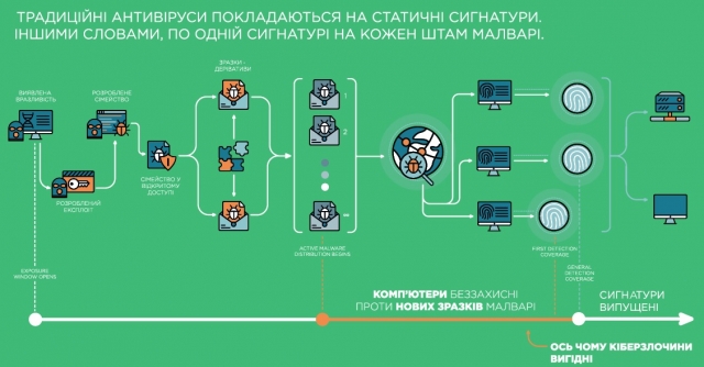 Традиційний антивірус протидіє кожному новому штаму малварі, проте має фундаментальне обмеження, так званий «Час до детекту» (рис.).