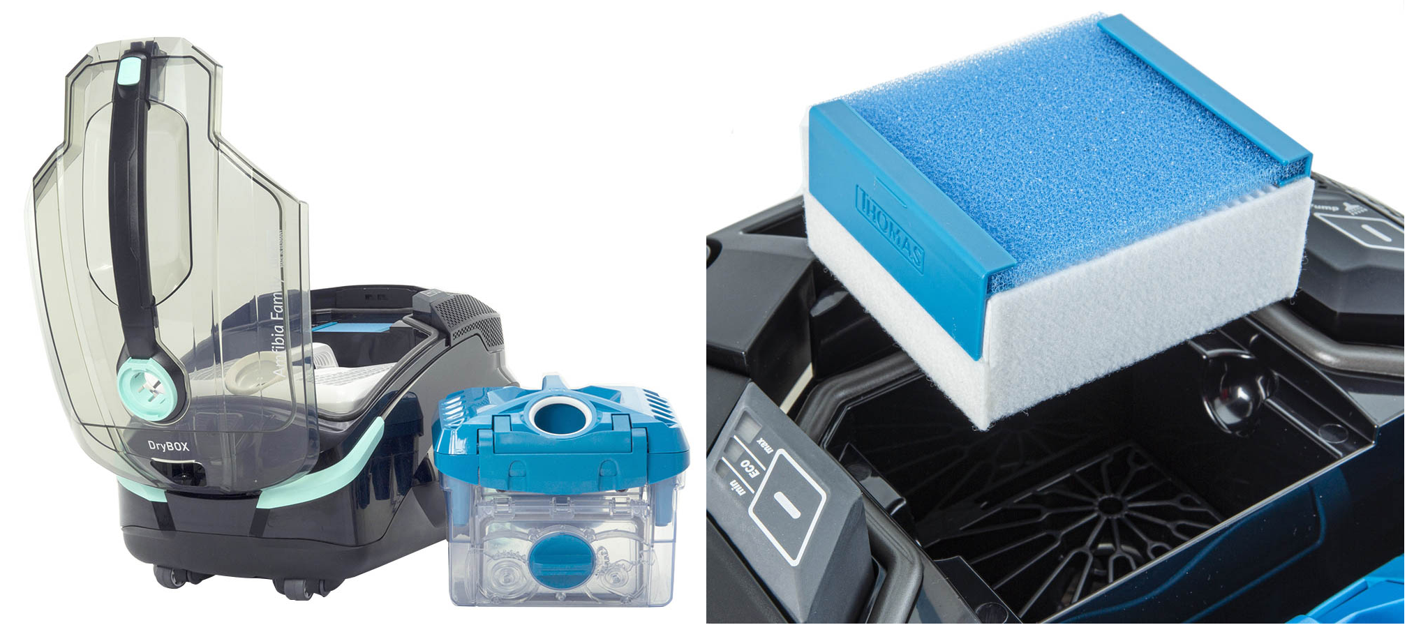 Значуща перевага THOMAS DRYBOX AMFIBIA FAMILY – можливість вибрати між двома системами відповідно до потреб. Хочете прибрати швидко та без зайвого клопоту? Вибирайте DryBOX. Маєте трохи більше часу і прагнете освіжити повітря? AquaBOX стане надійним союзником у боротьбі за чистоту. Замінити системи фільтрації можна за кілька секунд.