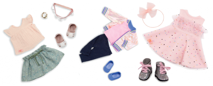 Щоби зробити гру ще цікавішою, до ляльок Our Generation (46 см) можна вибрати різноманітні аксесуари: одяг, взуття, прикраси, гребінці, стрічки та багато іншого. З наборами, як-от «All Aflutter», «Pink & Colorful» та «Love to Shine», дівчатка зможуть створювати безліч образів і розігрувати різноманітні сюжети.