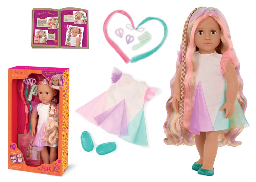 Заплітай, грай та створюй казкові зачіски разом із Тессі від Our Generation! Ця яскрава 46-сантиметрова лялька має неймовірне веселкове волосся, яке можна укладати, прикрашати та навіть подовжувати або вкорочувати натисканням однієї кнопки! Тессі — справжня зірка зачісок, яка надихне дітей на творчість і самовираження.