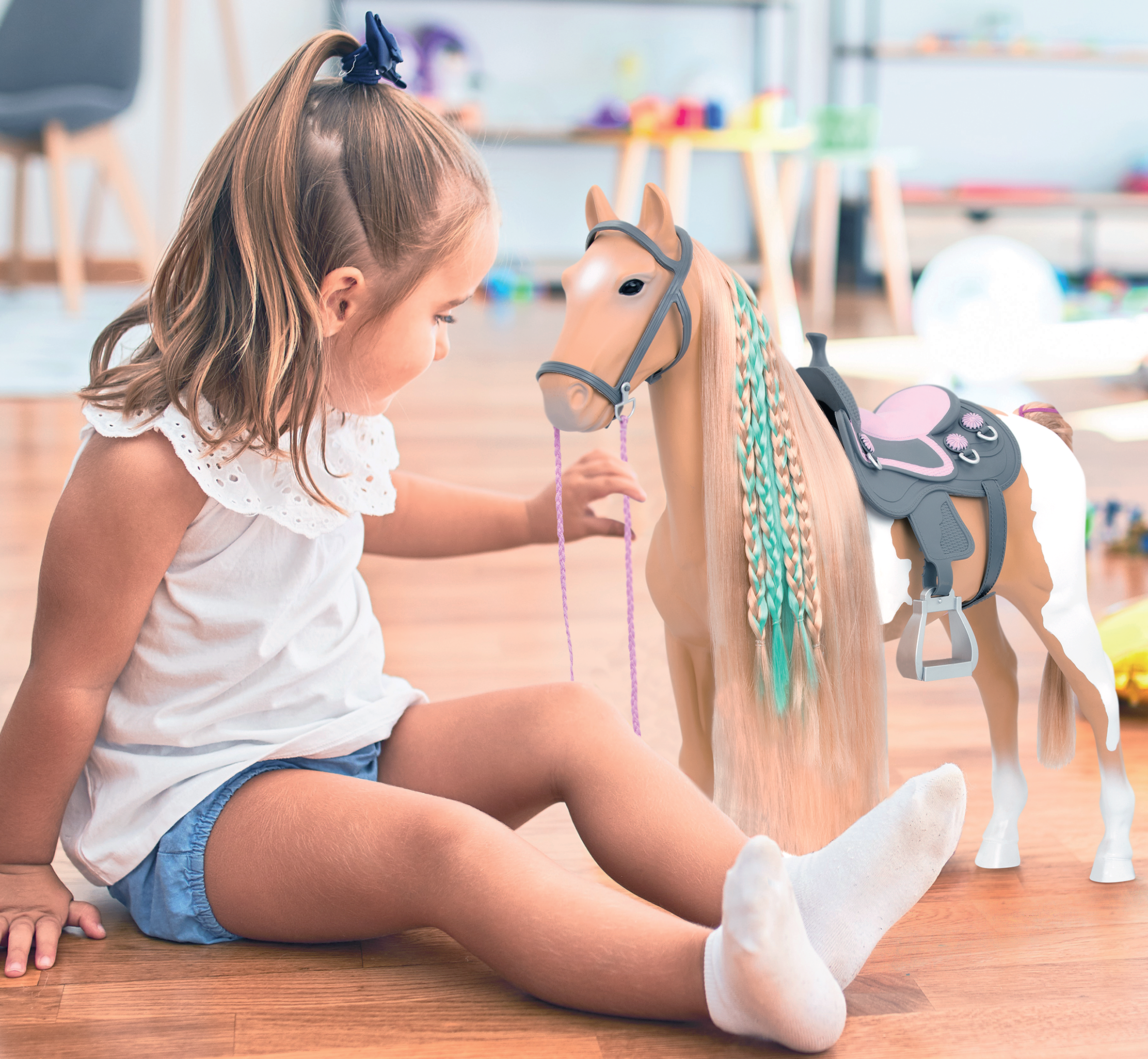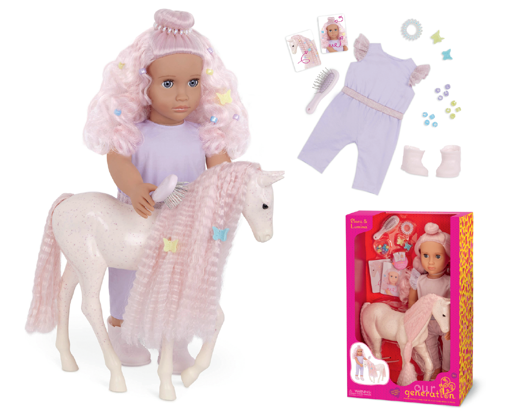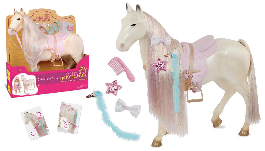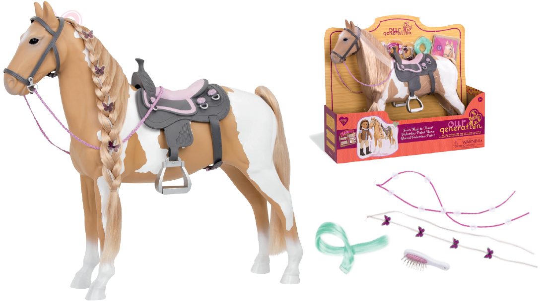 Розкішна світла грива та хвіст коня дають змогу створювати різні зачіски, що надихає малечу на творчість. Для догляду за твариною в комплекті є спеціальний гребінець, додаткові барвисті пасма та стрічки з метеликами та квітами для гриви, які допоможуть створити унікальний стиль для тварини. Коли кінь матиме неперевершений вигляд, посадіть ляльку Our Generation (46 см) у сідло в західному стилі та рушайте назустріч захопливим пригодам.