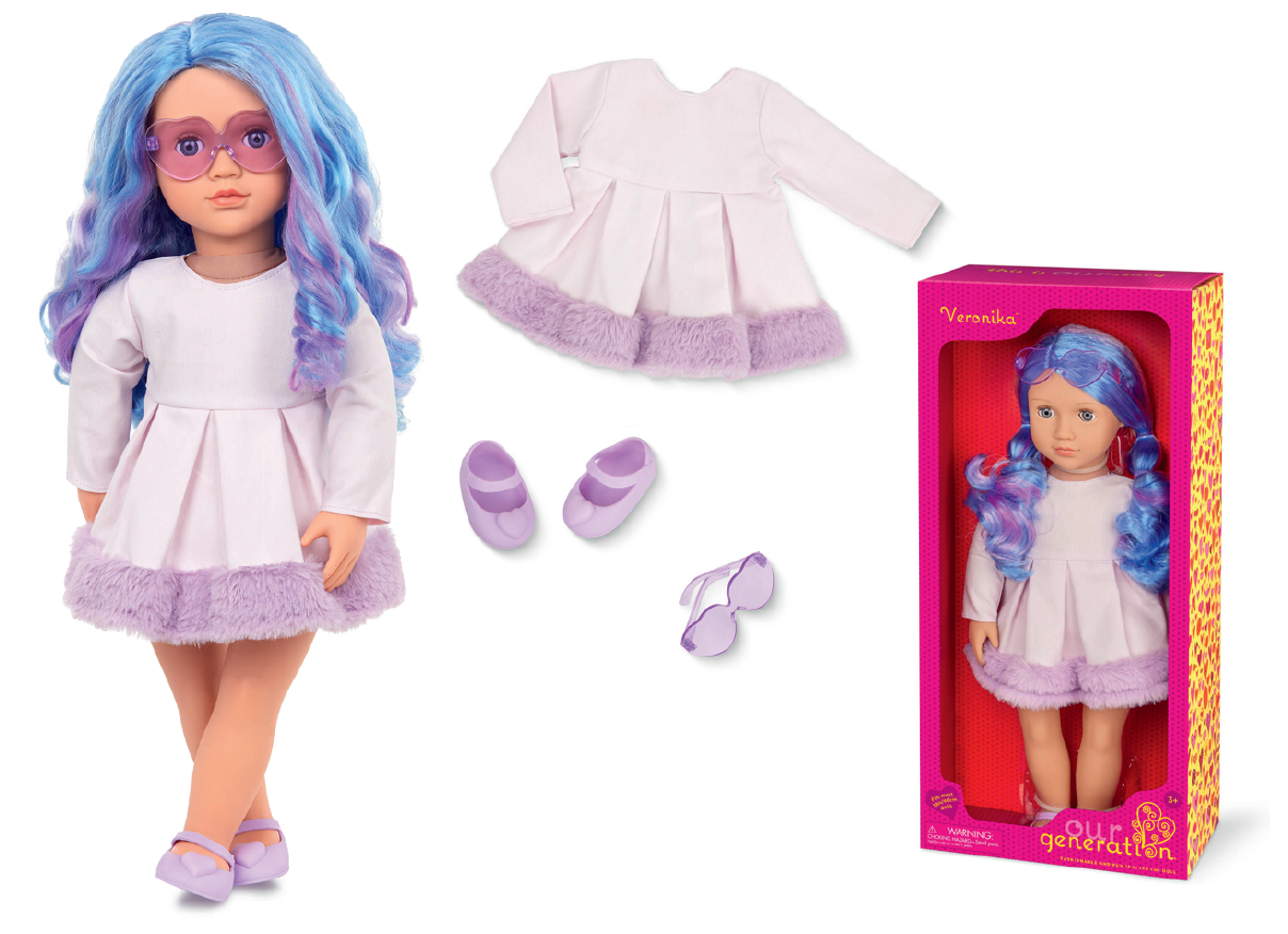 Лялька Our Generation Вероніка з різнокольоровим волоссям – це справжня ікона стилю з дивовижним кольоровим волоссям! Її довгі хвилясті пасма переливаються блакитними, фіолетовими та рожевими відтінками, а яскраво-блакитні очі з ефектом відкривання-закривання роблять її образ ще виразнішим.