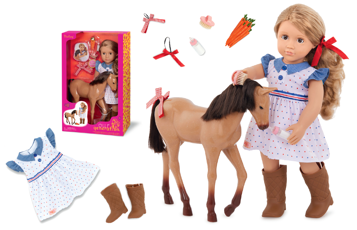 Розвивайте своє ранчо разом із Шеллі, та дізнайтеся як доглядати за новонародженим лошам! Шеллі - 46-сантиметрова ігрова лялька Our Generation, яка обожнює коней і мріє стати справжньою вершницею. Разом із нею до набору входить чарівне лоша породи Аппалуза висотою 30 см з блискучою шерстю, шовковистою гривою та хвостом, які можна розчісувати і прикрашати бантиком.