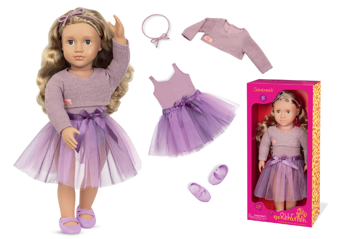 Танцюйте і сяйте разом із Саванною,46-см лялькою-балериною Our Generation з довгим хвилястим світлим волоссям і темно-синіми очима, які відкриваються і закриваються! Саванна може обертати шиєю, руками та ногами, виконуючи піруети та інші забавні пози балету, коли вона танцює на сцені. Одягніть в рожеву кофтину Саванну, коли вона репетирує свій виступ, а потім влаштуйте чарівне шоу у її приголомшливій балетній сукні! Вона має рожеве плаття-трико з світло-фіолетовою спідницею з вуалі та декоративною стрічкою на талії. А відповідна пов'язка додає додаткової нотки солодкості її зачісці. Комплектація: 46-см лялька Саванна, балетна сукня, кофтина, пов'язка із блискітками, пара балеток.