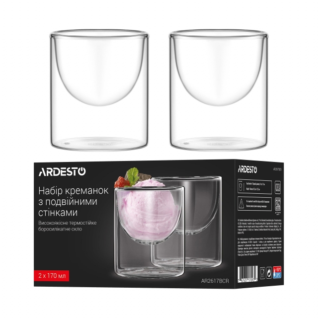 Гармонійним доповненням до чашок є набори креманок із подвійними стінками, які доступні в наборах по 2 шт. об’ємом 170 мл або 220 мл. Також виготовлені з боросилікатного скла, ці креманки вирізняються тим же рівнем надійності та елегантністю. Вироби стануть справжньою окрасою сервірування чи не будь-якого стилю, надаючи нотку вишуканості кожній трапезі. Їх створено для тих, хто цінує не тільки смак, але і презентацію.