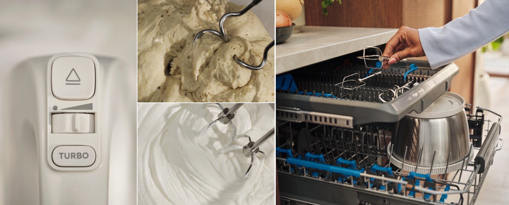 Ручні міксери 300 серії отримали оновлений сучасний дизайн, для виготовлення при­строїв використано перероблений пластик, що робить їх екологічно свідомим вибором. Також моделі мають збільшену потужність двигуна, яка тепер становить 500 Вт замість попередніх 450 Вт. Завдяки цьому можна ще швидше збивати будь-які інгредієнти та змішувати найгустіші маси ефективніше. Крім того, з п’ятьма налаштуваннями швидкості та режимом Turbo вдасться досягти потрібної однорідної консистенції для всіх улюблених рецептів. Ергономічне руків’я і м’яке покриття забезпе­чують зручне використання, надаючи змогу працювати максимально продуктивно.