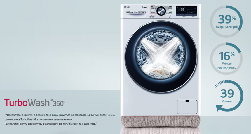 Одна з головних переваг моделей LG із технологією AI DD – функція швидкого прання TurboWash, яка забезпечує: