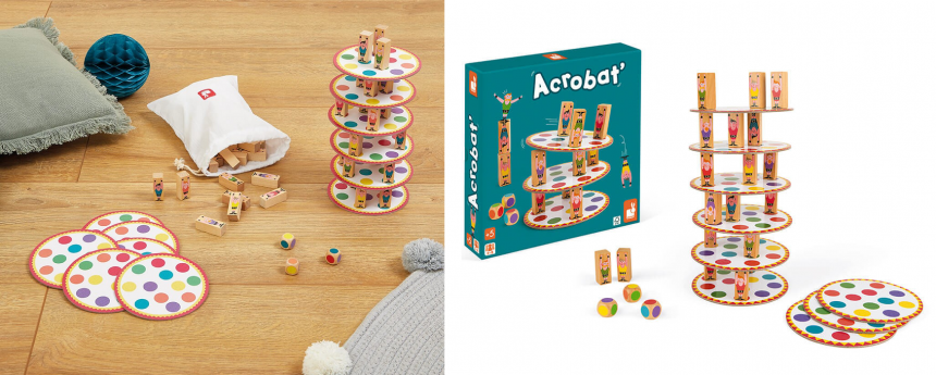 Janod «Акробат» – це справжнє циркове видовище на ігровому столі! Мета гри – збудувати найвищу вежу з акробатів, але будьте обачні – один необережний рух, і все може обвалитися! Кому вдасться зберегти рівновагу і стати справжнім майстром балансу? Гра розвиває моторику та навички планування.