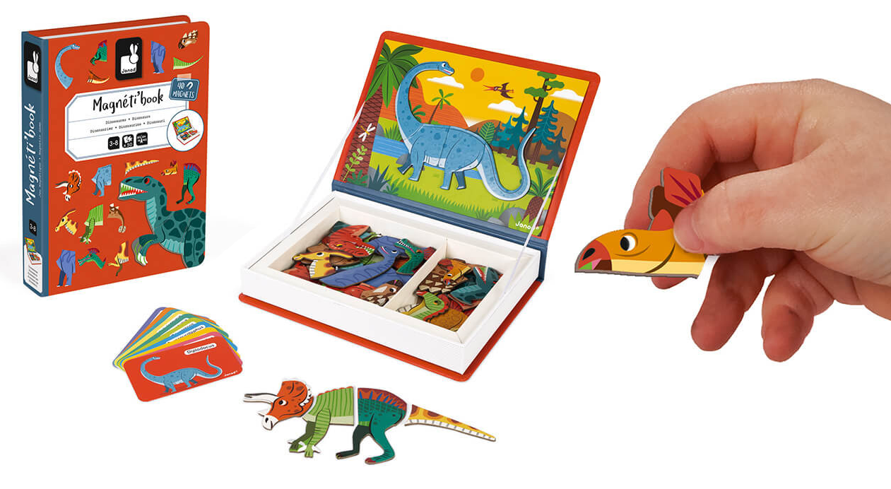 Відкрийте світ динозаврів разом із Janod! У наборі 40 магнітних частин динозаврів і 10 карток із повними зображеннями велетнів. Збирайте магнітні елементи згідно з картками-завданнями або ж дайте волю фантазії!