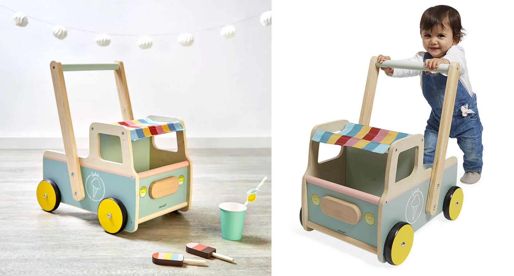 Автентичний візок для морозива Janod – це справжній розвивальний центр для малюків від 1 року! Він слугуватиме надійними ходунками, допоможе розвинути координацію рухів та уяву. А ще це чудовий привід для рольових ігор і спілкування з батьками. Завдяки різноманітним аксесуарам у формі морозива та містким відділенням для зберігання візок стане улюбленою іграшкою на тривалі роки. У дизайні поєднано фарби на водній основі та натуральну деревину екологічно керованих лісів, сертифікованих FSC.