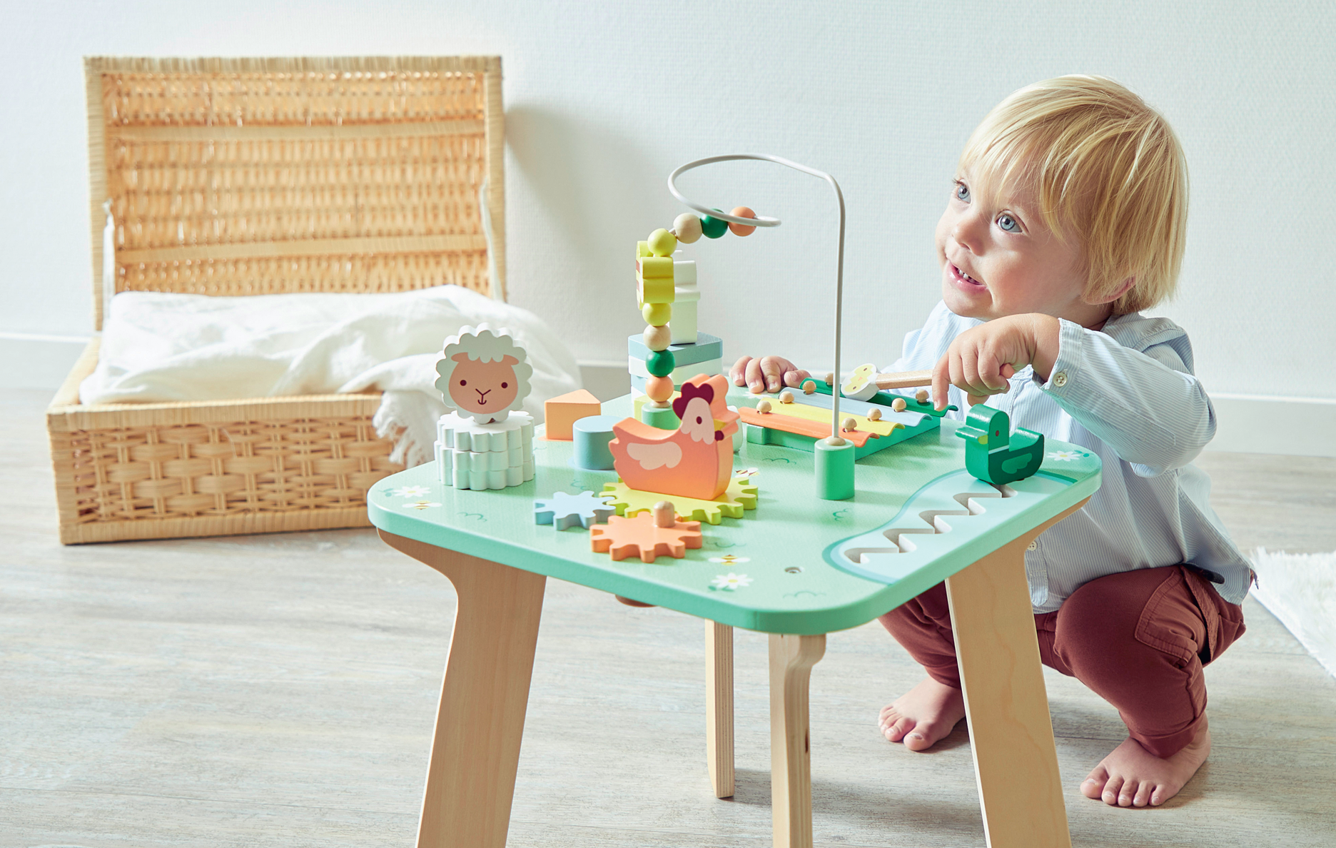 Ігровий столик Janod «Поле» може стати першим фермерським двориком для малюка, де він доглядатиме тваринок і гратиме для них мелодії. У комплекті розвивального столика наявні пірамідки у формі корівки та овечки, лабіринти із бджілкою та качечкою, ксилофон із паличками, сортер із геометричними фігурами та шестерні з півником. Багатофункціональний стіл допоможе розвивати слух і дрібну моторику, зрозуміти причинно-наслідкові зв’язки, а також навчитися рахувати та вивчити форми.