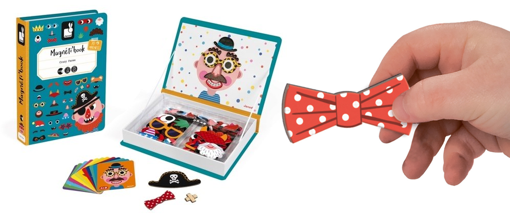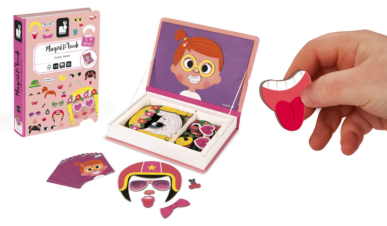 Завдяки магнітним наборам дітлахи ознайомляться з емоціями, образами, розвиватимуть уяву та творче мислення. Відкривши магнітну книгу, діти знайдуть малюнок з обличчям-«базою», картки з підказками та магнітні елементи (частини обличчя, зачіски, аксесуари тощо). Магніти легко та весело чіпляти – вся родина може долучитися до створення різноманітних образів.