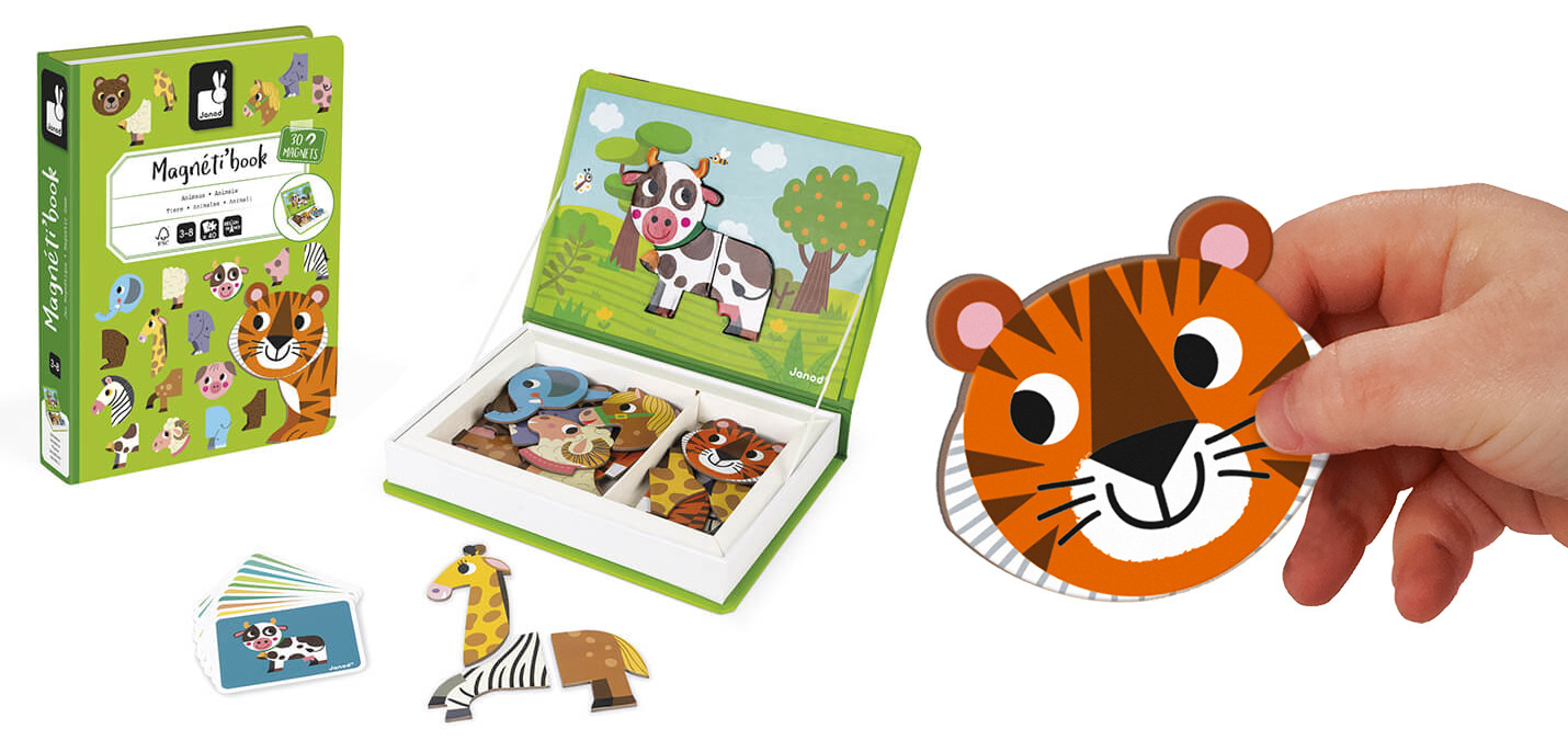 Магнітна гра Janod «Тварини» складається з 30 магнітних елементів і 10 карток-завдань. Відкривши книгу, необхідно скласти з деталей тваринку, яку зображено на картці. Крім того, дитина зможе вигадувати навіть фантастичні створіння, використовуючи різні елементи, у такий спосіб розвиваючи фантазію та уяву.