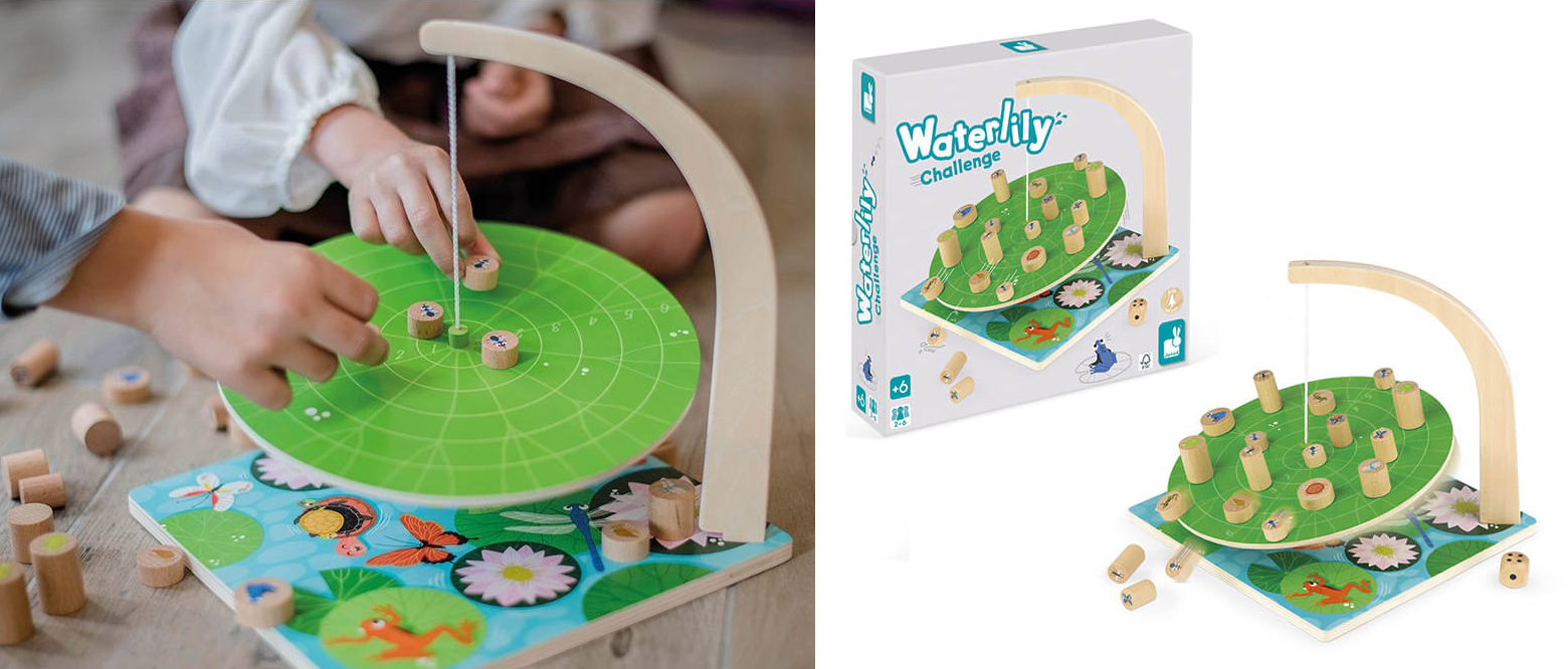 «Латаття» – це захоплива гра-балансир, яка перенесе гравців на спокійну водну гладінь, де поміж зеленого листя мешкають різноманітні комахи та тварини. Мета гри – розмістити дерев’яні фігурки із зображеннями цих мешканців на великому листі латаття так, аби вони не впали.
