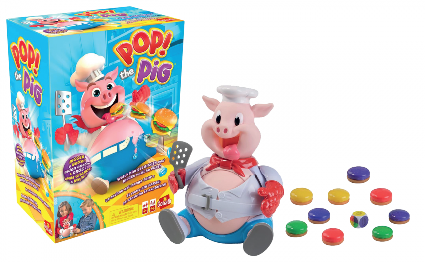 Pop the Pig — це найжадібніша гра, в яку ви коли-небудь грали! Нагодуйте свиню та уникайте луснення в цій захоплюючій екшн-грі! По черзі годуйте свиню гамбургерами і спостерігайте, як її шлунок стає все більше і більше. Але майте на увазі, що він може луснути! Для 2 – 6 гравців, вік 3+.