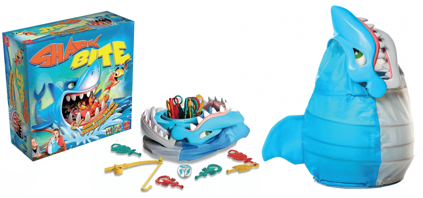 Приготуйтеся добре провести час, граючи в Shark Bite! Спіймай рибу і стань переможцем, але якщо акула стрибне, ти станеш її обідом! Розміщуйте веселих і барвистих морських істот в ігровому пристрої за допомогою оснащення і хапайте друзів, щоб почати грати. Гравці по черзі кидають кубик і ловлять морських мешканців вудками. Але будьте обережні – ніколи не знаєш, коли вкусить акула!