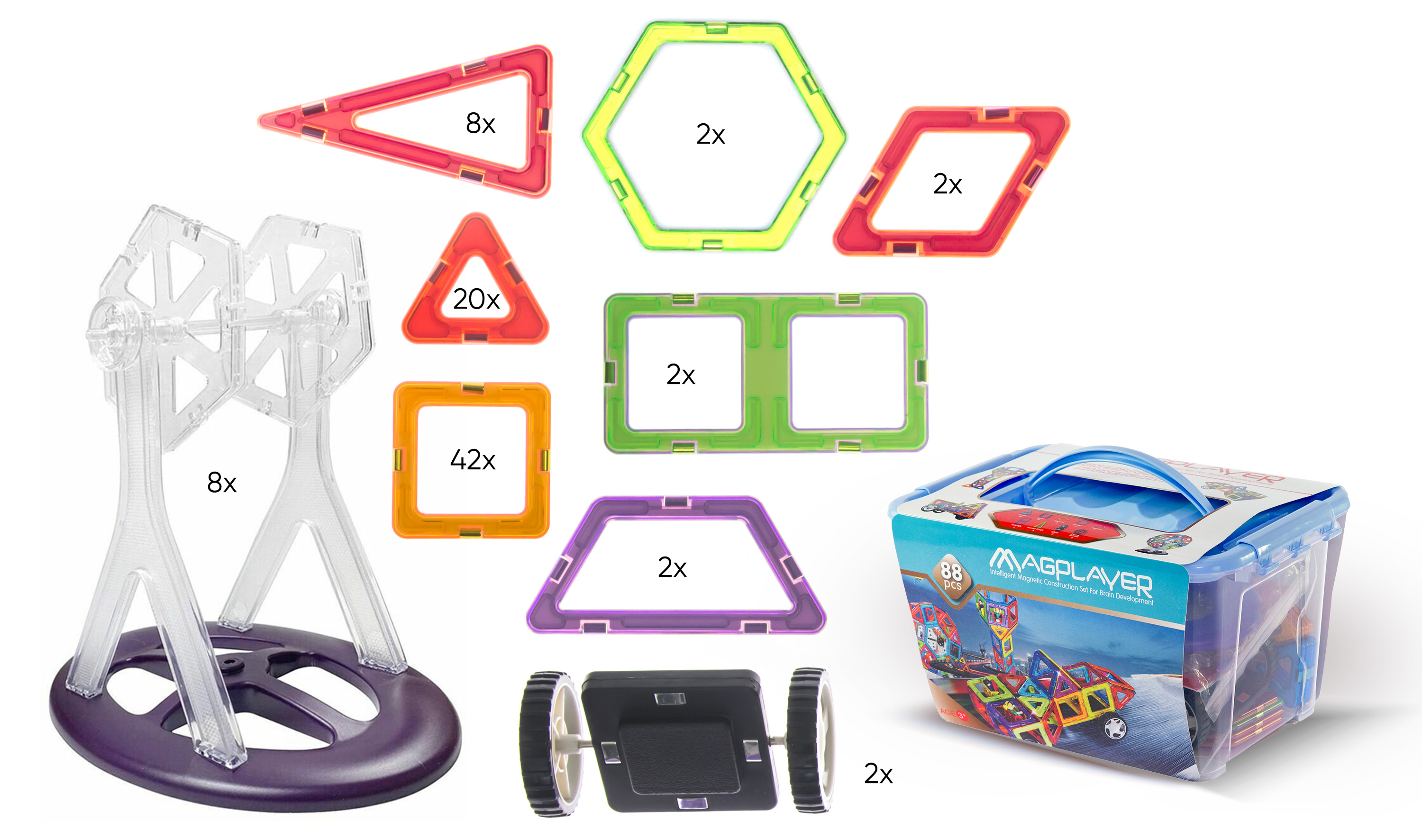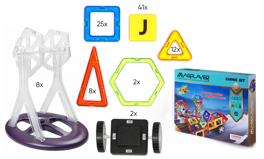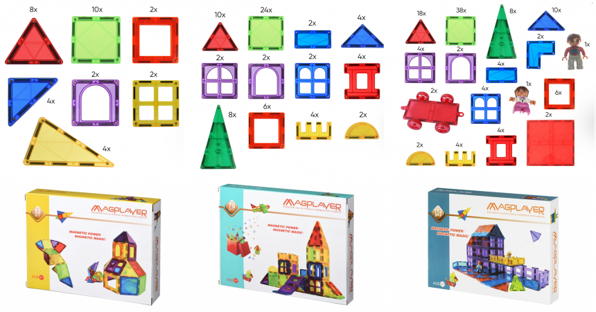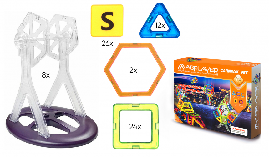 Магія і сила магнітів - слоган MagPlayer, який говорить про те, що діти за допомогою цього конструктора зможуть підвищити рівень мислення та моторики рук. Цей набір середнього рівня складності складається з 72 деталей - трикутників, квадратів, гексагонів, а також елементів з рухомими частинами. У кожного елемента є магнітні кріплення, які забезпечують надійну і міцну фіксацію. Це дозволить зібрати необмежену кількість різних фігур, будівель і навіть механізмів.