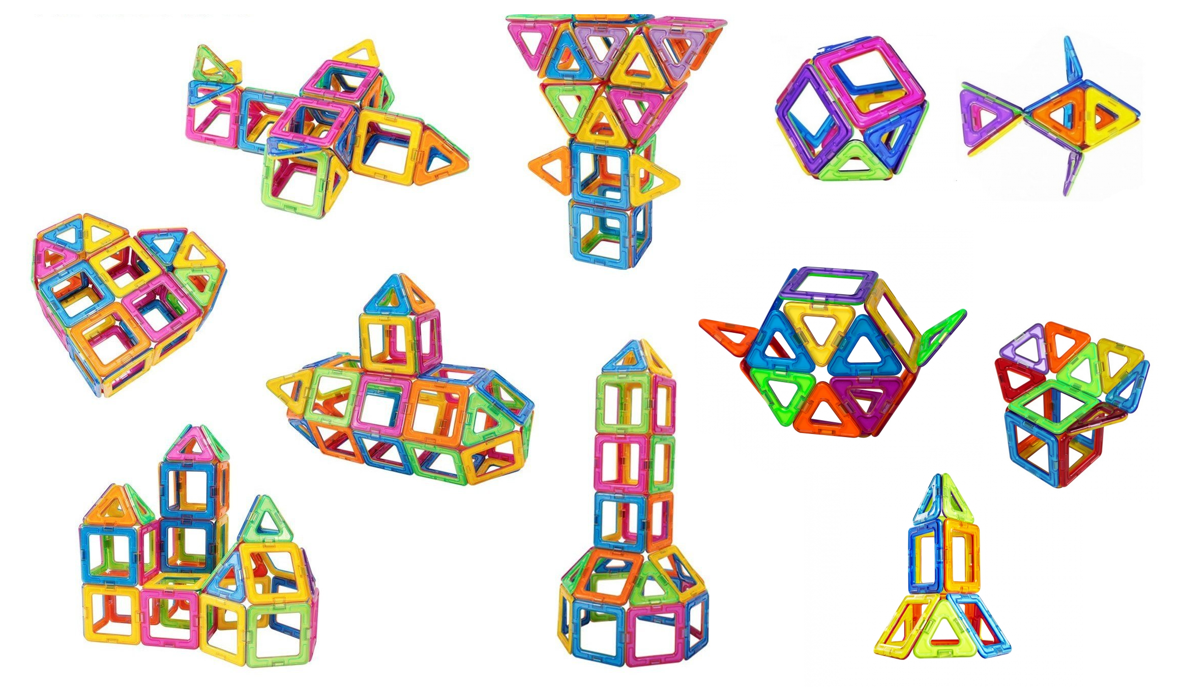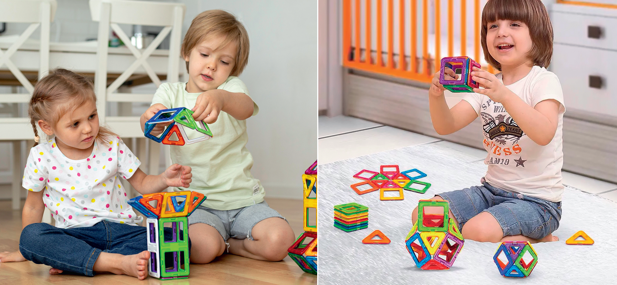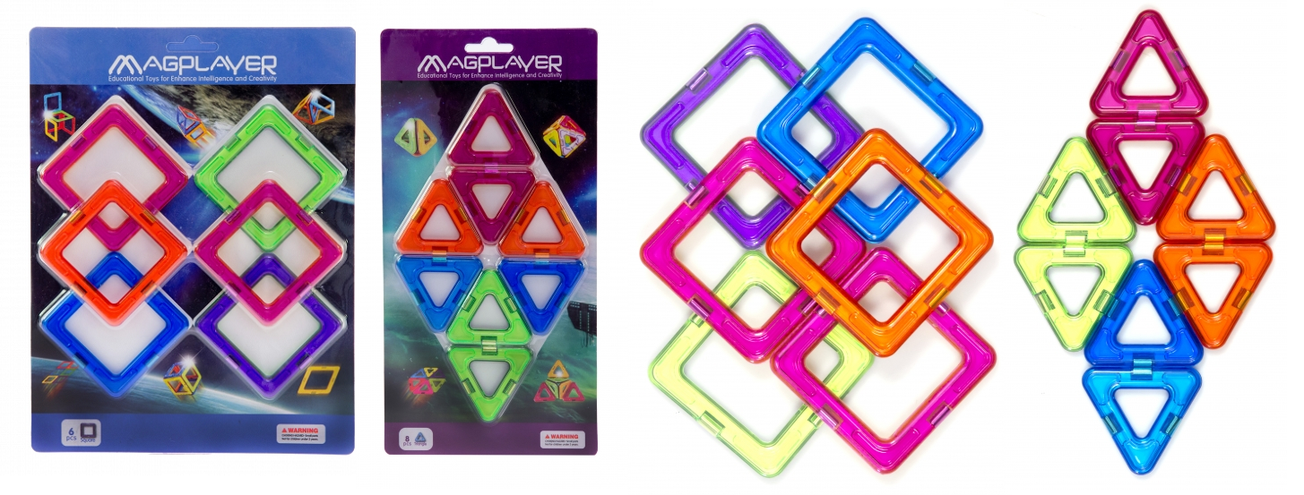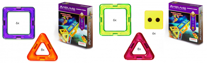 Це доповнення до базового магнітного конструктора. Кольорові квадрати та трикутники (6 або 8 штук у наборі) легко з’єднувати між собою і з іншими елементами Magplayer, відкриваючи ще більше можливостей для творчості. Завдяки цим наборам дитина зможе створювати складніші конструкції, додаючи до своєї гри нові кольори та форми.
