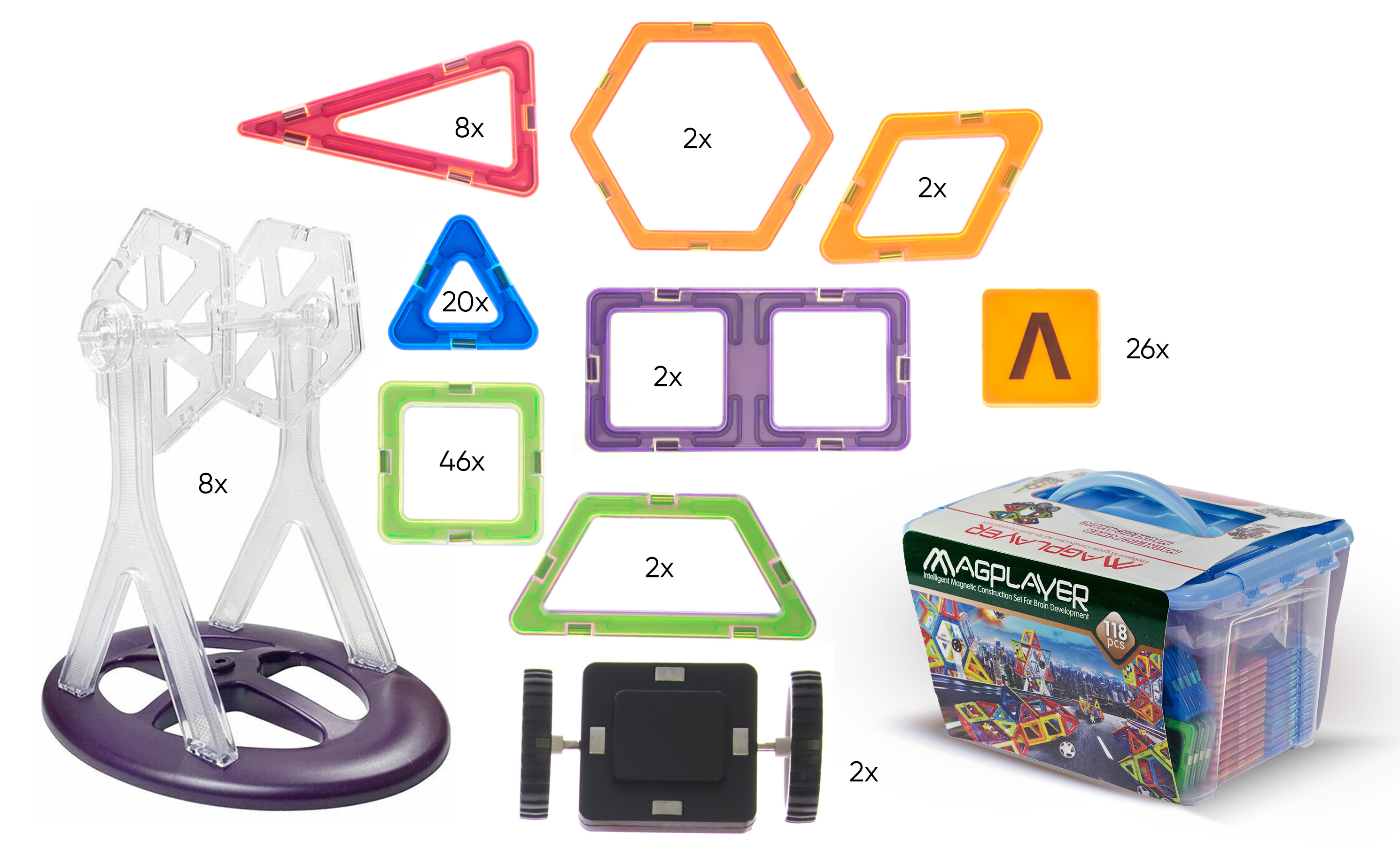 Великий набір MagPlayer складається з 118 деталей: трикутників, квадратів, шестикутників, трапецій і ромбів. Також він містить функціональні деталі: основи для вітряків або коліс огляду, двоколісні основи для автомобілів та елементи з літерами. Всі деталі оснащені магнітами, що не потребують дотримання полярності, тому дитина може кріпити елементи між собою будь-якою стороною. Пластикові елементи мають різнокольорове забарвлення, тому готові фігурки виглядають яскраво. Магнітний конструктор розвиває моторику рук та загальні розумові здібності. В комплект набору входять схеми для збірки фігур, тому дитина зможе конструювати сама. Конструктор поставляється у великому пластиковому контейнері, де можна зберігати всі деталі.