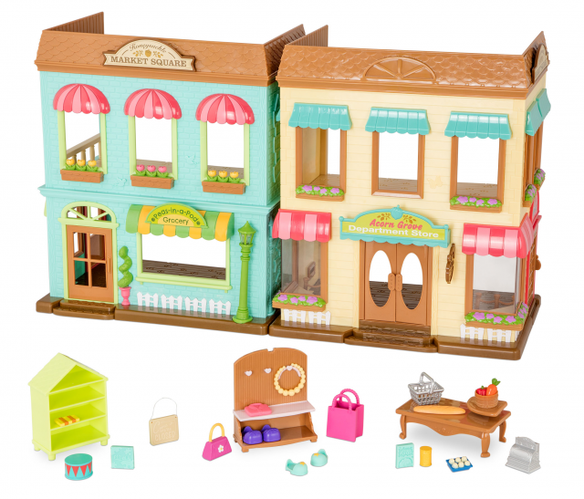 «Торговельний центр» Li'l Woodzeez – великий ігровий набір, який надовго захопить дитину. Це красива будівля з функціональним освітленням і повною деталізацією. Можна легко вигадувати безліч сценаріїв для гри, наприклад: встановити стіл, запастися полицями та повісити вивіски з розпродажем. У цьому наборі іграшок є касовий апарат, як у справжньому магазині. З-поміж аксесуарів – одяг, іграшки, музичні інструменти й широкий асортимент продуктів. У комплекті – 38 предметів.