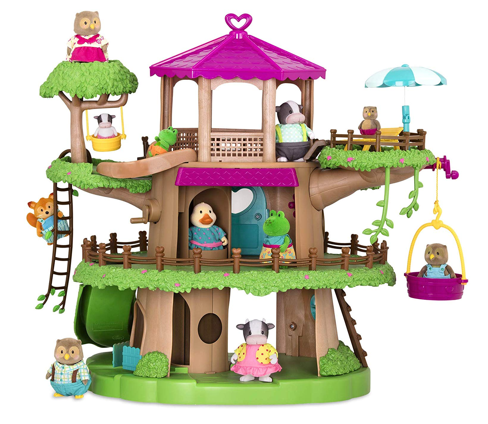 Оригінальний набір Дерево-будинок від Li'l Woodzeez призначений для лісових мешканців долини Ханісакл. У будиночку три поверхи, багато віконець 2 ліфта у вигляді підвісної кошики і всередині будинку (ручне управління), драбинка, гірки. На третьому поверсі встановлений столик з парасолькою і шезлонгом, затишна альтанка, і підвісні гойдалки. На другому поверсі - можна облаштувати спальню. Потрапити на перший поверх з другого можна скотившись з гірки, спустившись по драбинці або на ліфті.