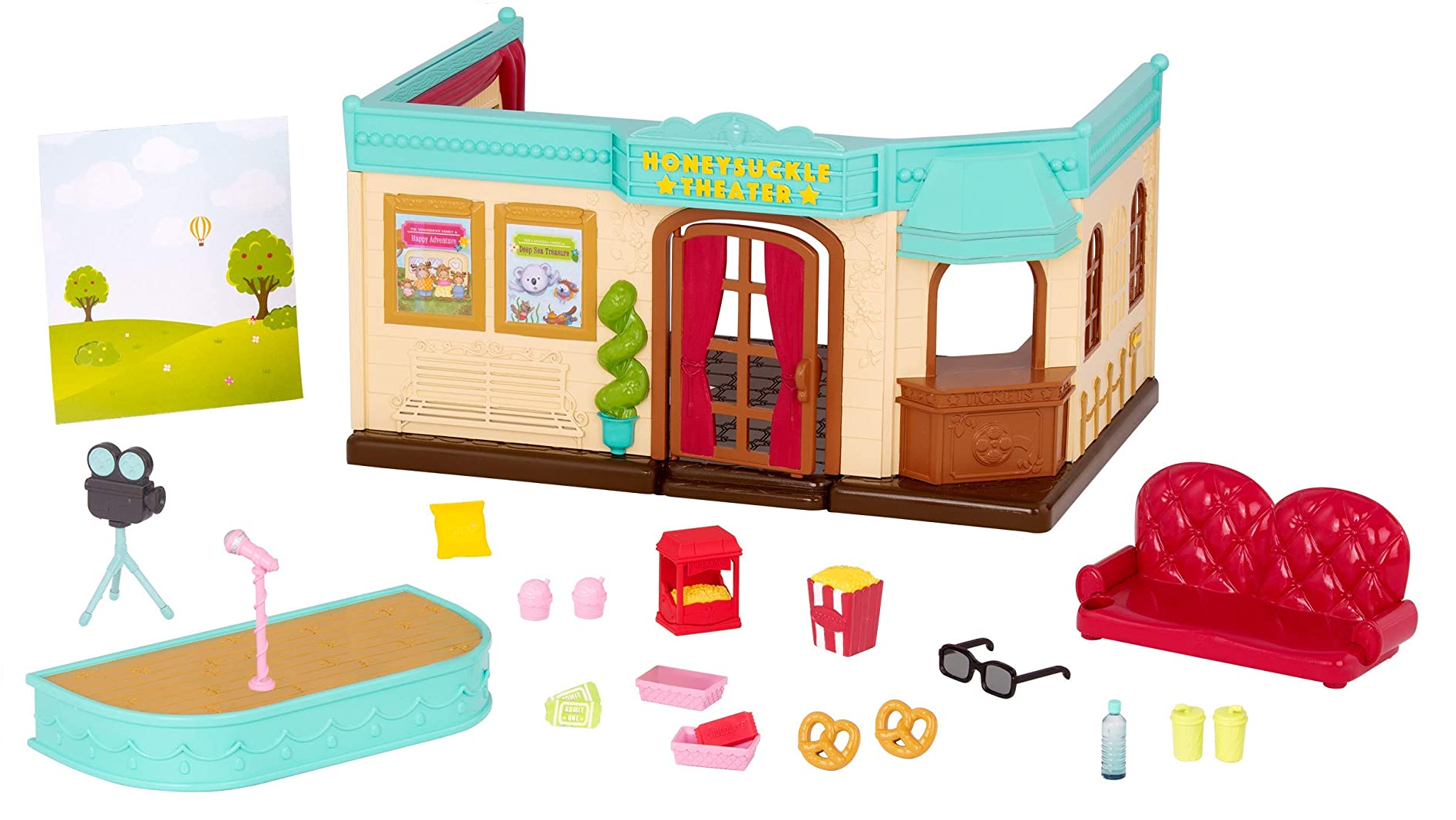 Подивіться фільм у театрі Honeysuckle! Цей ігровий набір є ідеальним способом розважити ваших персонажів-тварин Li'l Woodzeez. Подивіться, як вони купують квитки та закуски у прилавку. Є кренделі, газовані напої та навіть автомат для попкорну! Тоді , ваші пухнасті друзі можуть сісти, дочекавшись початку фільму. Цей набір театральних іграшок містить багато крутих аксесуарів, зокрема камеру, 3D-окуляри, сцену, мікрофон тощо. Ніч у кіно — це завжди хороша ідея. А тепер, тссшш! Ось-ось почнеться! Фігурки тварин та ігрові набори Li'l Woodzeez продаються окремо. Кількість штук: 23. Рекомендовано для дітей від 3-х років.