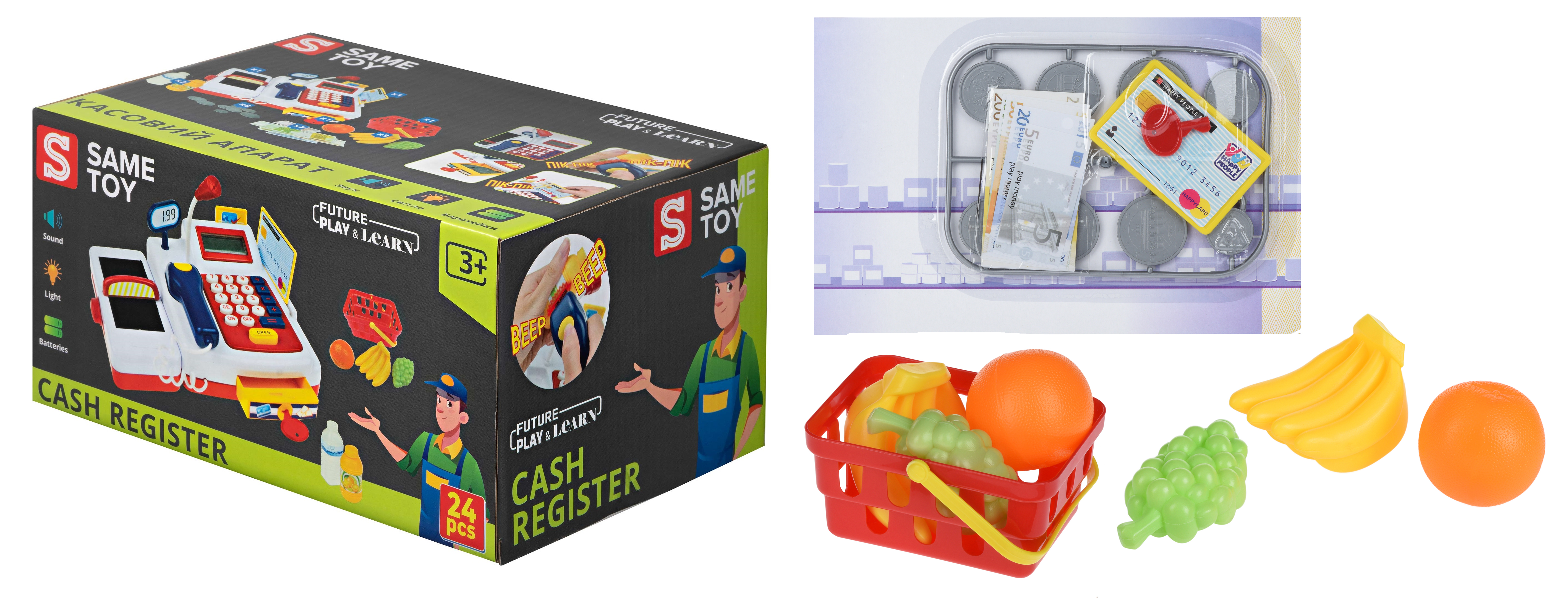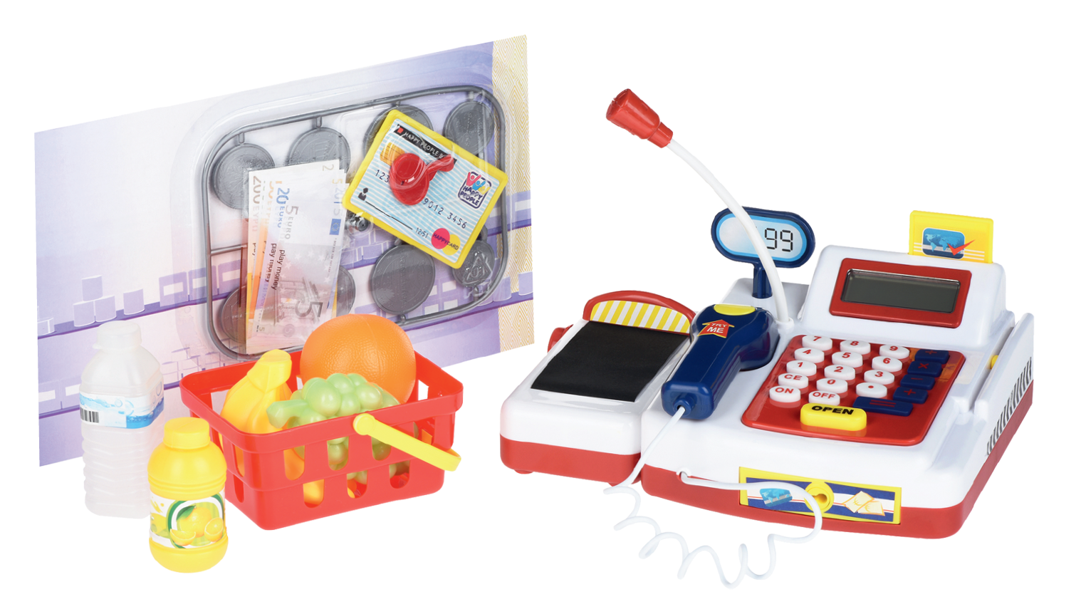 У комплекті є все необхідне для захопливої гри: касовий апарат із калькулятором і мікрофоном, сканер, кошик із набором продуктів, кредитна картка, грошові купюри й навіть монетки. Як і справжній касовий апарат, іграшковий замикають на ключик, а відчинити його можна, натиснувши кнопку Open.
