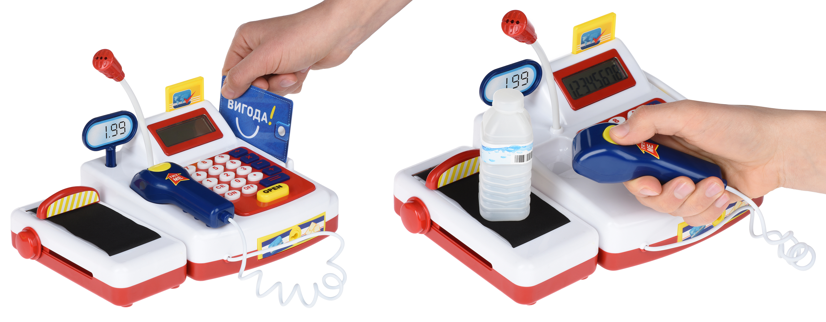 До того ж касовий апарат відтворює реалістичні звуки, які точно відповідають тим, які можна почути біля каси в справжньому супермаркеті, що робить гру ще цікавішою (наприклад, звук сканування товару). Дорослий може взяти на себе роль покупця або касира, відтворюючи життєві ситуації, які допоможуть дитині зрозуміти основи фінансової грамотності.