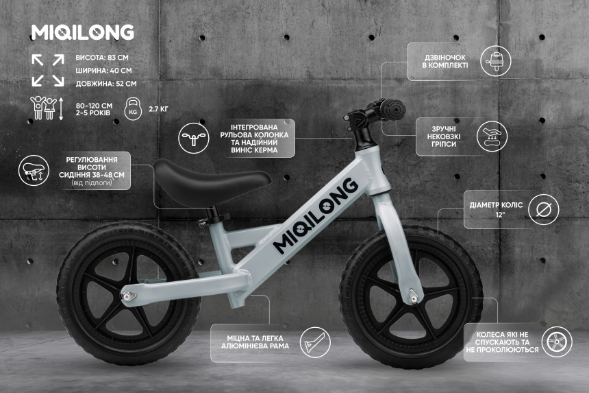 Дитина мріє про надійного двоколісного «друга»? Біговел Miqilong HP 12“ – оптимальний вибір для активного дозвілля! Цю модель створено із застосуванням новочасних технологій, зокрема алюмінієва рама («крилатий метал», без якого неможливо уявити сучасну авіацію) забезпечує легкість і міцність, а мінімалістський дизайн тішить око. Завдяки низькому центру ваги та ергономічному регулюванню висоти керма й сидіння біговел згодиться як для навчання, так і впевненого катання.