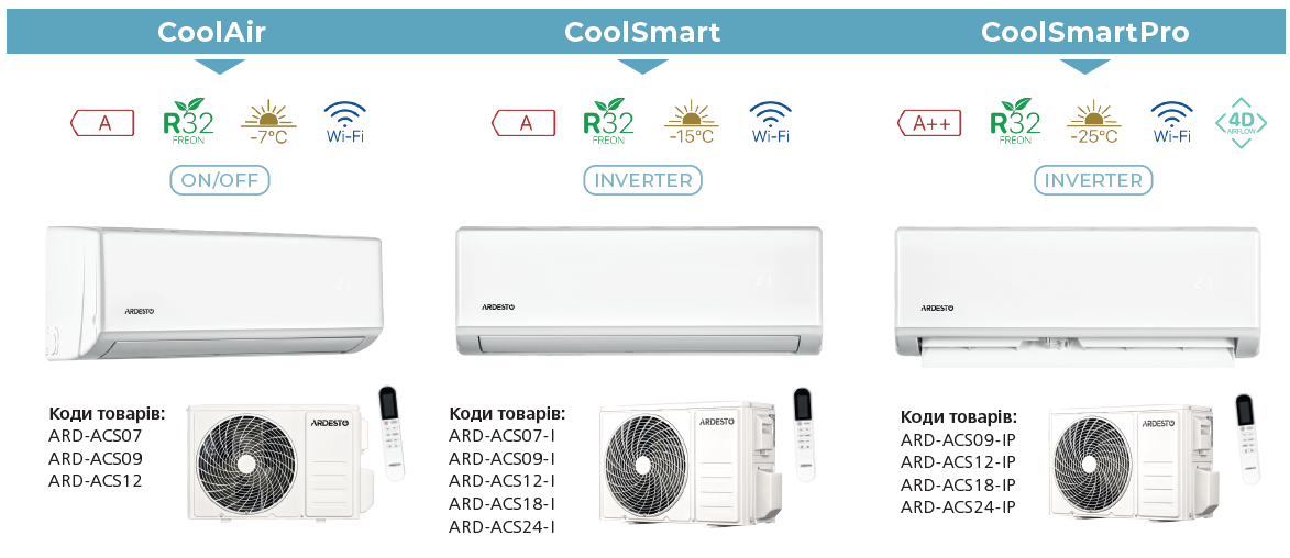 Спліт-система ARDESTO складається з двох блоків: внутрішнього, який встановлюють у приміщенні, і зовнішнього, що змонтовано просто неба. Завдяки особливостям конструкції забезпечено тиху роботу та ефективне охолодження або обігрів. Спліт-системи ARDESTO поділено на три основні серії – CoolAir, CoolSmart і CoolSmartPro, які різняться за рівнем енергоефективності, технологічними можливостями та діапазоном робочої температури.