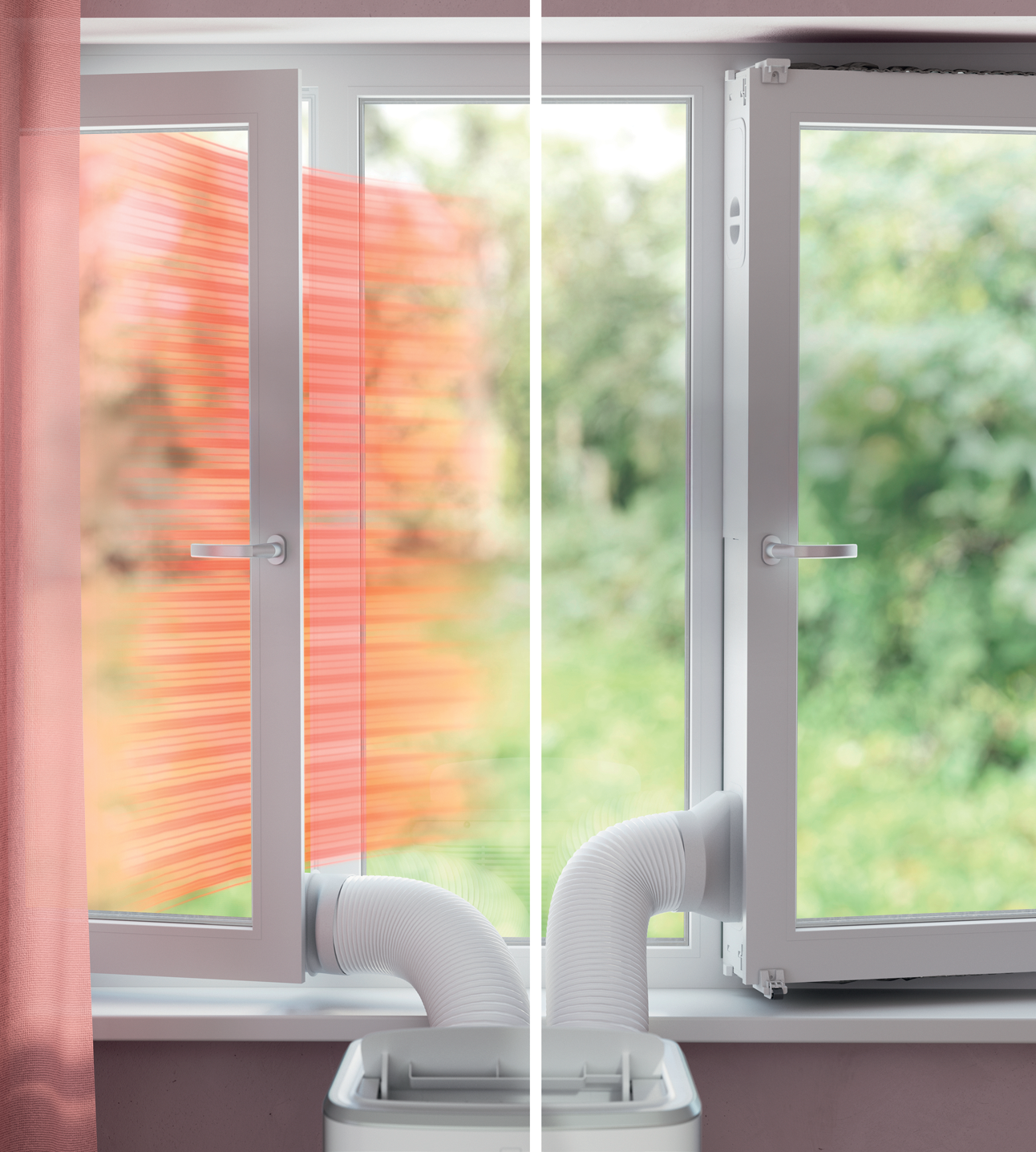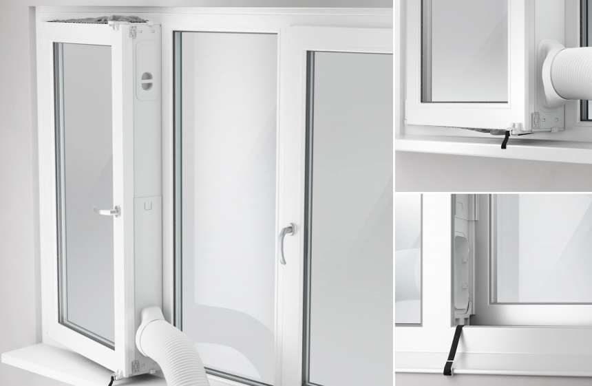 Преміальний монтажний комплект для встановлення мобільного кондиціонера у вікно/двері. Встановлення без інструментів для типів вікон із бічними петлями для швидшого та енергоефективнішого охолодження приміщення.