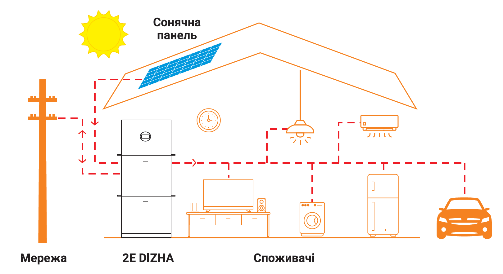 PowerWall DIZHA – це уніфіковане рішення для використання у квартирах, будинках та офісах. Ультракомпактний формфактор дає змогу заощадити простір, зберігаючи стиль і гармонію інтер’єру. Завдяки вбудованим коліщатам пристрій легко транспортувати. PowerWall 2E DIZHA є найпотужнішою з лінійки 2Е системою резервного живлення із сучасним гібридним інвертором 10 000 Вт і підтриманням продажу в мережу.