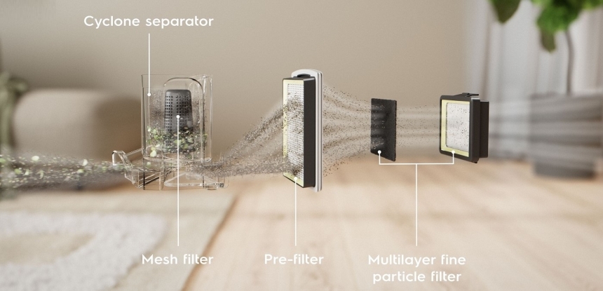 • Циклонний сепаратор: мінімізує засмічення і гарантує стабільну роботу пилососа, а ємний контейнер для сміття (2 л) не доведеться часто спорожнювати.