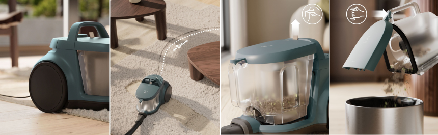 Що особливого? По-перше, ефективне прибирання без необхідності періодично купувати мішки. По-друге, гігієнічне очищення контейнера однією рукою без контакту з пилом. І по-третє, корпуси виготовлено з переробленого пластику, а все опаковання – із сертифікованого матеріалу без використання фарби.