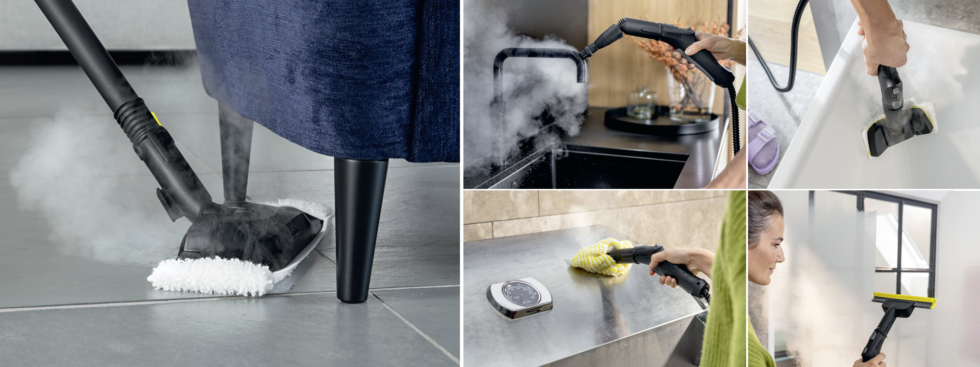 Після очищення поверхонь парою часто залишається волога. І саме тоді в пригоді стане віконний пилосос нового покоління WV 6 Plus, який вдало доповнює SC 2 EasyFix. Замість того щоб витирати вікна чи інші скляні поверхні вручну, можна просто зібрати залишок вологи віконним пилососом – і жодних потьоків. Його всмоктувальна насадка з гнучким краєм щільно прилягає до поверхні, забезпечуючи максимальну ефективність процесу й безкомпромісну чистоту. Тож дзеркала, вікна, стінки душових кабін та кахель завжди лиснітимуть!