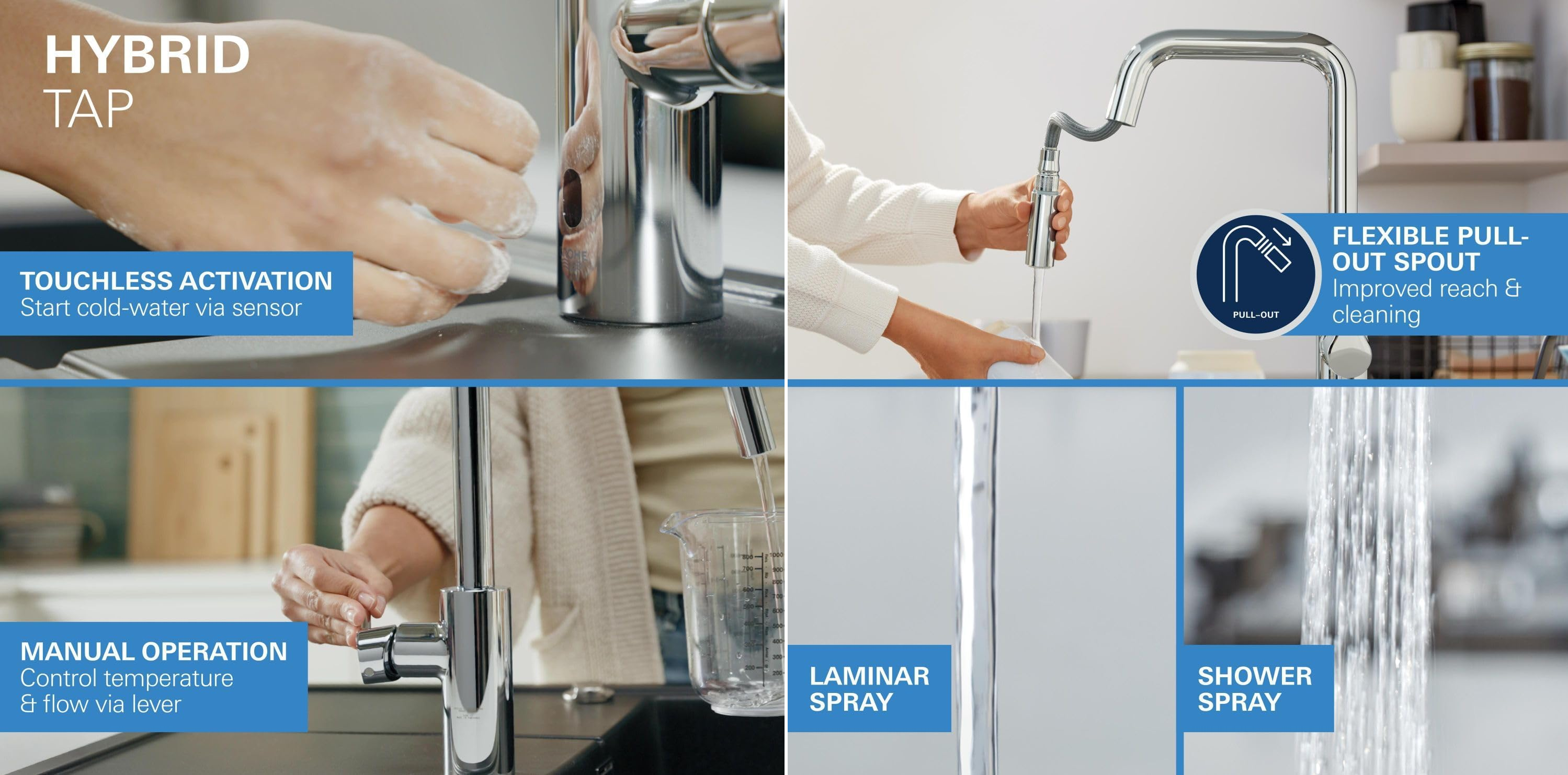 Однією з основних інновацій GROHE є гібридний кухонний змішувач, що поєднує ручне та безконтактне керування. Завдяки вбудованому інфрачервоному сенсору користувач може активувати потік холодної води без дотику – особливо зручно за умов підвищеної гігієнічності або коли руки зайняті. Для подавання гарячої води чи зміни температури передбачено ручне керування, яке завжди має пріоритет, забезпечуючи повний контроль процесів.