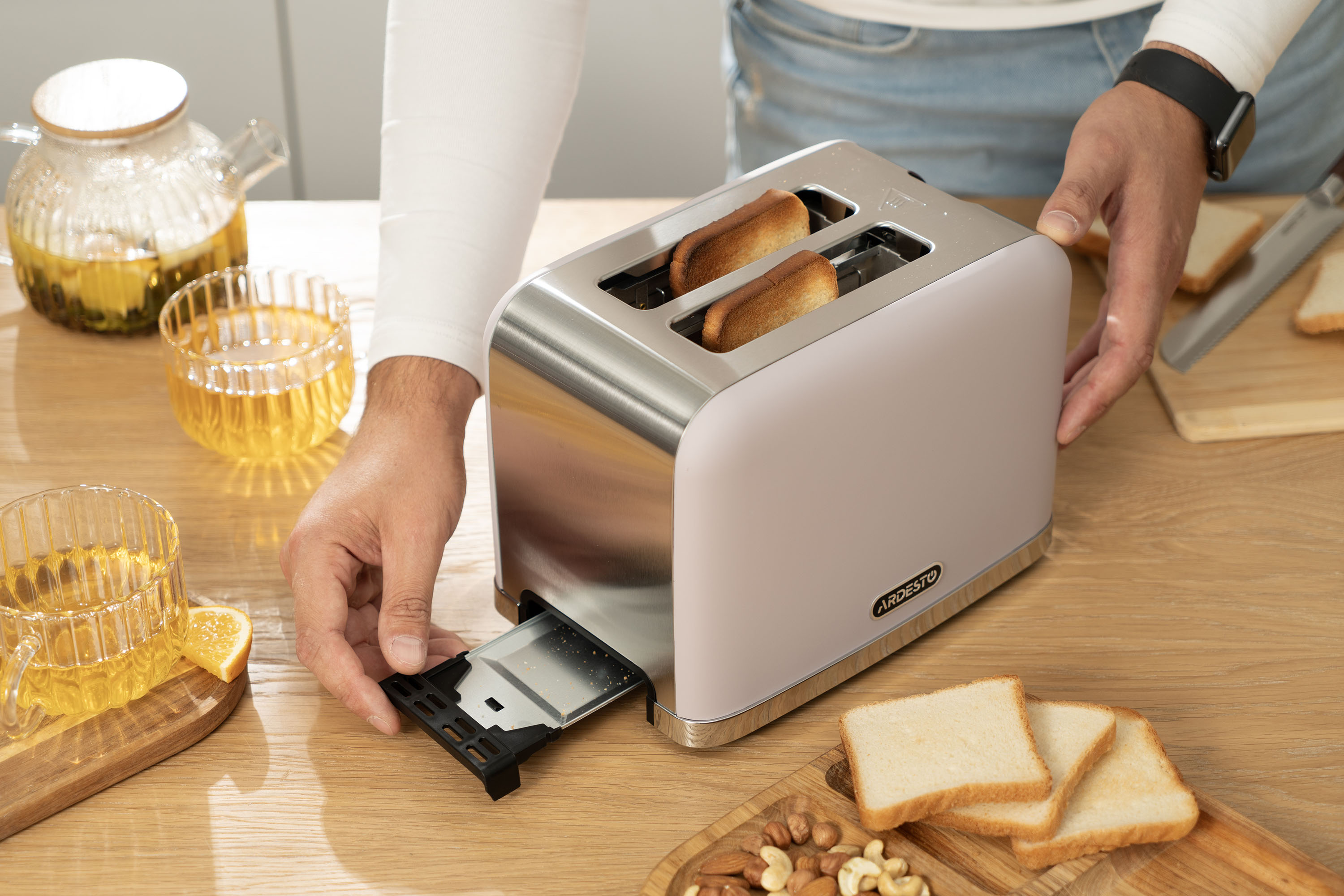 Легкий догляд – знімні елементи (фільтр у чайнику, лоток для крихт у тостері) спрощують очищення.