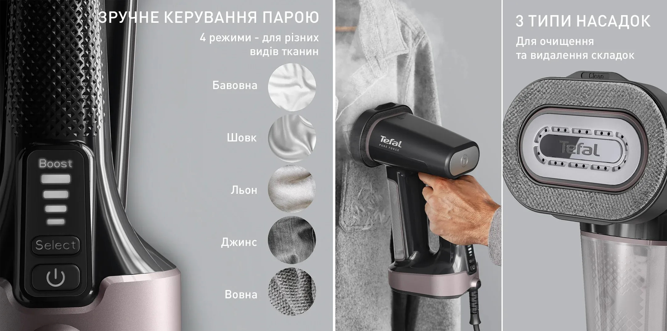 Tefal Pure Force - це універсальне 3-в-1 рішення для прасування, відпарювання та видалення ворсу й пилу з улюбленого одягу. Інноваційна конструкція дозволяє легко перемикатися між вертикальним відпарюванням і горизонтальним прасуванням. Завдяки ексклюзивній системі змінних насадок пристрій ефективно очищає тканину від ворсу та мікропилу, водночас оновлюючи делікатні речі. Повний набір функцій для бездоганного догляду за одягом. Режим Boost забезпечує на 300% більше пари порівняно з режимом Eco - для виняткової ефективності. До 12 хвилин безперервної подачі пари зроблять щоденний догляд за одягом простішим і зручнішим.