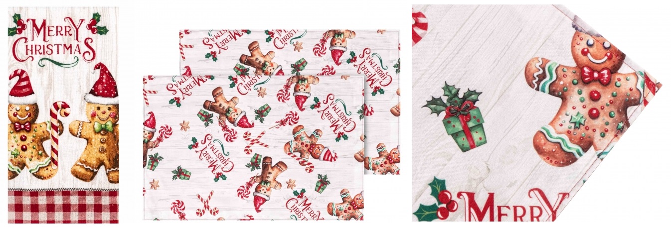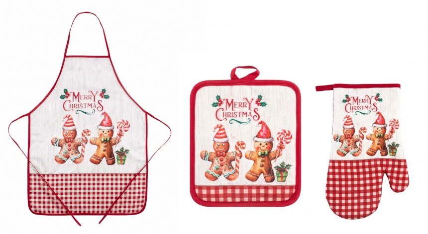 Колекція «Імбирний пряник» у червоній палітрі створює справжній новорічний настрій на кухні. Прихватки та рукавиці (коди товарів: ART04HG, ART05HG, ART14HG) додають яскравого акценту навіть під час приготування страв. Рушники з натуральної бавовни (код товару: ART3863HG) приємні на дотик і добре вбирають вологу, а фартух (код товару: ART12HG) не лише захищає одяг, а й формує святковий образ для господині чи господаря. Ранер (код товару: ART01HCG) оздоблює стіл, роблячи його більш виразним, тоді як скатертини двох розмірів (коди товарів: ART07HG, ART08HG) створюють гармонійний фон для загальної композиції. Фінальним штрихом є серветки – окремі або в наборах (коди товарів: ART06HG, ART15HG), які надають сервіруванню охайності та завершеності.