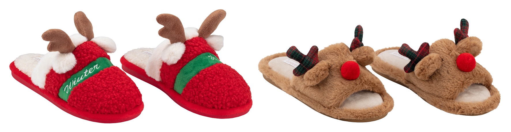 До цієї ж палітри належать закриті червоні капці з оленями (коди товарів: ART2536DR, ART2538DR, ART2540DR), а також відкриті моделі в коричнево-­червоній гамі (коди товарів: ART2536DB, ART2538DB, ART2540DB), які мають стриманіший вигляд, але все ж зберігають святковий стиль.