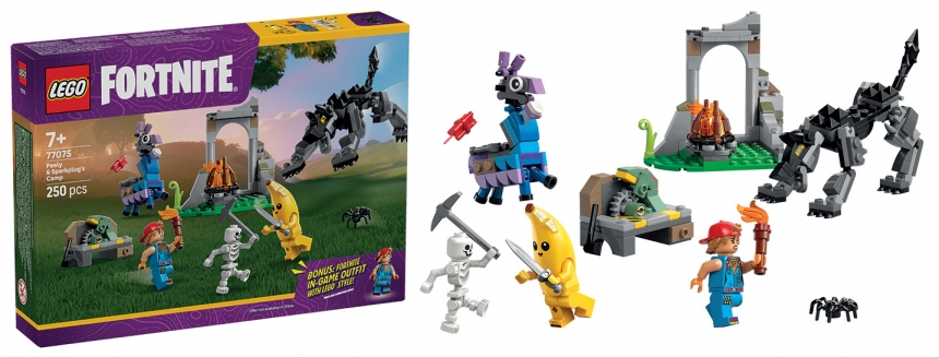 LEGO® Fortnite® 77075 Табір Peely та Sparkplug відтворює атмосферу перших випробувань у світі LEGO Fortnite Odyssey. Набір із 250 деталей містить мініфігурки Peely, Sparkplug і скелета, а також фігурки Supply Llama та вовка з рухомими елементами. Сцени з багаттям, верстаком і руїнами можна перебудовувати для нових сюжетів. QR-код в інструкції відкриває бонусне вбрання Sparkplug у грі. Цікаве складання поєднується з рольовими пригодами у знайомому всесвіті.